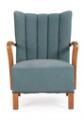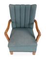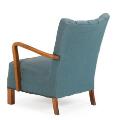 Lænestol med stel af eg, betrukket med blåt møbelstof. 1930–40'erne.