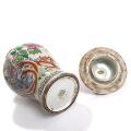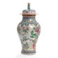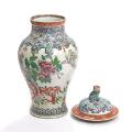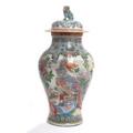 Samson vase af porcelæn, dekoreret i farver med føniks fugle i have og blomster, lågknop i form af fo-hund. Mærke under bund. Ca. 1900. H. 46.