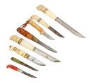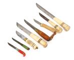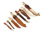 Seven Finnish knives and and a Norwegian knife - all in their sheaths.