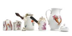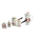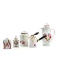 A collection of European porcelain, decorated in overglaze colours and manganese with flowers, vases and landscape, consisting of two tea caddies, a pear-shaped coffee pot and two chocolate pots with straight wooden side handles. Meissen a.o. 18th-19th century. H. 11–29 cm. (5)