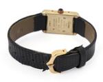 Tank Trinity af guldbelagt sølv, ref. 3 66001. Quartz-værk. 1990’erne. Firbenrem med Cartier spænde af guldbelagt stål. 21×28 mm.