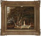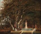 View from a forest with a memorial. Inscribed P. R. Oil on paper laid on canvas. 26.5×31.5 cm.