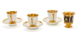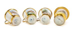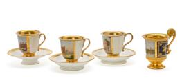 Fire kopper dekorerede i farver og guld med prospekter: Parti af Bredgade, Kongens Nytorv, Frederiksborg og Badehuset; samt tre underkopper. Den Kongelige Porcelainsfabrik, ca. 1840. (7)