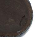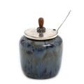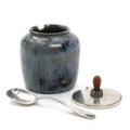 Marmeladekrukke af stentøj, dekoreret med blå glasur med mørkeblå elementer. Stemplet Løvemose. Forsynet med låg og ske af sterlingsølv. Stemplet Hans Hansen, anno 1939. H. 12.5.