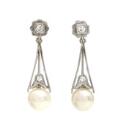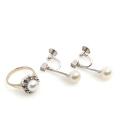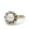 Diamant- og perlering samt et par -øreskruer af 14 kt. hvidguld prydet med kulturperler og brillant- og enkeltslebne diamanter. Vægt ca. 8 g. Ringstr. 48. Øreskruer L. 2,7 cm. (3)