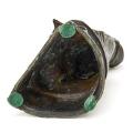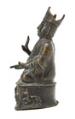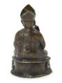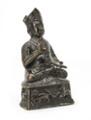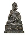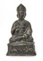 Figur af patineret bronze i form af buddhistisk lama siddende i dhyanasana på trone støbt med dyr, i venstre hånd en bog, den højre løftet. Tibet/Kina, 19. årh. Vægt 437 g. H. 14 cm.