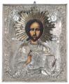 A Russian icon depicting “Christ Pantocrater”. Tempera on panel with metal rizza. 20th century. 32×27 cm.