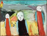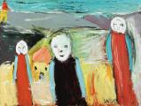 “Figur i landskab”, 1981. Sign. WSO; sign. med titel og datering på bagsiden. Olie på masonit.