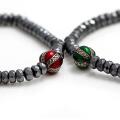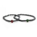 To pyritarmbånd med elastik prydet med talrige facetslebet pyrit samt perle med henholdsvis grøn og rød emalje og talrige enkeltslebne diamanter. Perlediam. 3–7 mm. Indvendig diam. 5,5–6,5 cm. Ca. 2013.