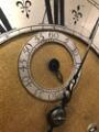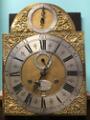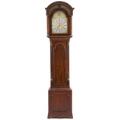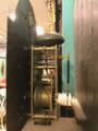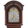 Engelsk standur i kasse af mahogni med beslag aaf forgyldt bronze, skive af forgyldt messing med gennembrudte hjørne ornamenter, forsølvet timekrans, værk med helslag og dato viser. Sign. William Webster, Exchange Alley, London. 18. årh.s midte. H. 225. B. 56. D. 27.