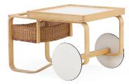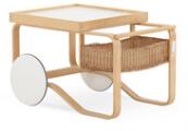 Serveringsvogn med stel af formbøjet birk opsat på store hvide hjul. Plade med hvide kakler samt underliggende fletkurv. Model 900. Formgivet 1935. Udført hos Artek, Finland. H. 60. L. 91. B. 66.