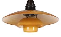 PH-pendel med 3/2 skærme af gul matglas, fatning af bakelit. Stemplet Patented. Udført hos Louis Poulsen, 1930'erne. Diam. 28,5.