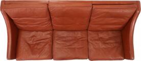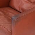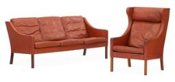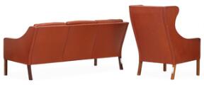 Three seater sofa and easy chair with mahogany legs, upholstered with red brown leather. Model 2209 and 2204. Manufactured and marked by Fredericia Stolefabrik. L. 186 cm. (2)