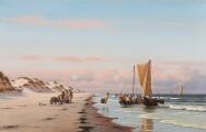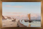 Strandparti med fiskere, der bringer fangsten ind. Signeret Johan Neumann 1919. Olie på lærred. 82×128 cm.