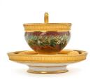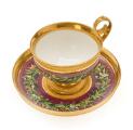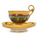 Kongelig mindekop af porcelæn, Hetsch model med svungen hank, dekoreret i farver og guld på rødbrun grund, underkoppen med Kong Christian VIII og Dronning Caroline Amalie af Danmarks kronede monogram samt dato og årstal i anledning af kongeparrets sølvbryllup “1815 d: 22de Mai 1840”; omgivet af krans af myrter. Den Kongelige Porcelainsfabrik, mærket i underglasur blå, og senere i overglasur.