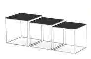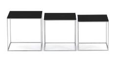 “PK 71”. Et sæt på tre indskudsborde med kubeformet stel af stål. Top af sort akryl. Formgivet 1957. Udført hos Fritz Hansen. H. 25/27,2/28,6. L./B. 25/26,5/28,2. (3)