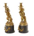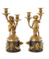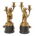 Et par Franske kandelabre af forgyldt og patineret bronze forestillende unge bacchante & satyr, efter model af Clodion. Louis XVI form, 19. årh.s slutning. H. 47 cm. (2)