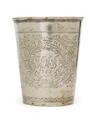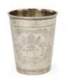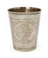 Large silver beaker engraved with ornamentation as well as owner's initials and dating in a wreath, CESB - AMD - 1783. Maker Johannes Zønnichhsen Buxlund, licensed in Aarhus 1744. H. 11.5 cm.