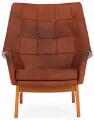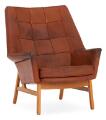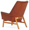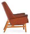 “Glimminge”. Lænestole af eg. Sæde, sider og ryg betrukket med brunt farvet, dybthæftet skind. Udført OPE, Sverige ca. 1960'erne.