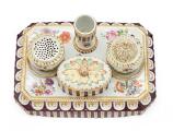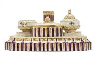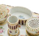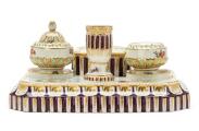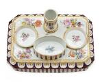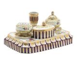 Skrivetøj af porcelæn med fast lysestage og æske samt løst blækhus og sandhus. Kannelurerne stafferede i lilla, bladornamenter på låg og huse i grønt og guld. Den Kongelige Porcelainsfabrik ca. 1780'erne. B. 22 cm.