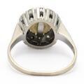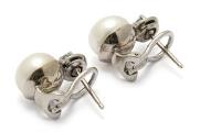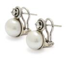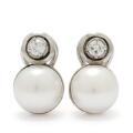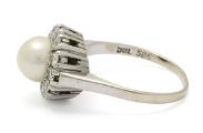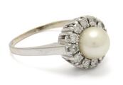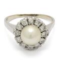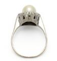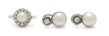 A pearl and diamond jewellery set comprising a pair of ear studs and a ring each set with a cultured pearl encircled by numerous brilliant-cut diamonds, mounted in 14k white gold. Weight in total app. 12 g. Pearl diam. app. 7–9 mm. Size app. 54.5. (3)