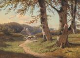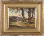Solskin på en skovsti. Sign. F Kraft. Olie på malepap. 15×20,4.