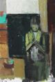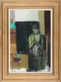 Interiør med kvinde der syr, 1958. Signeret og dateret SE, 58. Olie på masonit. 48×32 cm.