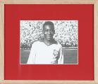 Originalt s/h pressefotografi af den brasilianske fodboldspiller Pelé (Edson Arantes do Nascimento; 1940–2022) som ung. Ca. 1960. Bagside med restriktionsstempler og rester af pålimet nyhedstelegram. Egetræsramme med dobbeltglas. Lysmål 13×17,5 cm. Rammemål 25×29 cm.