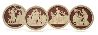 Four partly painted terracotta plaques. 487. L. Hjorth. Diam. 25.5 cm. (4)