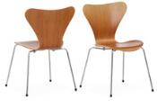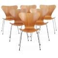 “Syveren”. Sæt på seks stole med ben af stål. Sæde og ryg af mahogni. Model 3107. Formgivet 1955. Udført og mærket hos Fritz Hansen. (6)