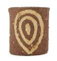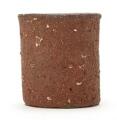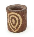 Lille cylindrisk vase af uglaseret stentøj, dekoreret med udsparet, bladlignende ornament indlagt med lys stentøjsmasse. Sign. Salto, 1943 samt 9116. Kgl. P., men ej mærket. H. 6,2. Diam. 5,4.