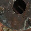 Repairs to top. One leg repaired. Dent to front. Wear due to age and use.