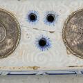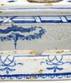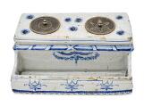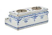 A Swedish faience writing set of rectangular form decorated in blue on relief ground, marked Rörstrand and dated 1754. Silvered metal ink stands. H. 8 cm W. 21 cm D. 13 cm.