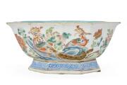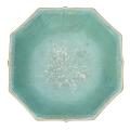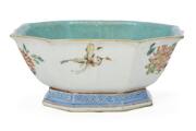 A Chinese enamelled porcelain bowl of octogonal form painted with phoenix birds, blooming flowers and a butterfly, interior and base turqouise glazed. Tongzhi 1861–1875 base mark and peiod. 19.5×19.5 cm.