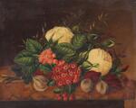 Opstilling med roser og rødtjørn. Usigneret. Olie på træ. 15×18,5.