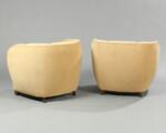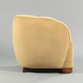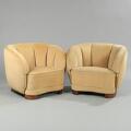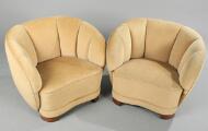 Et par overpolsterede lænestole med buet front og ben af bejdset bøg. Sæde, sider og ryg betrukket med beige velour. 1930–40erne. (2)