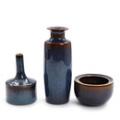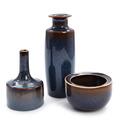 To vaser samt skål af stentøj, dekoreret med blåbrun glasur. Sign. CHS. Udført hos Rörstrand. H. 5,5–17,5. (3)