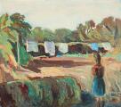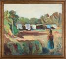 Pige iagttager vasketøjet. Sign. Helge Chr. Olie på lærred. 80×90.
