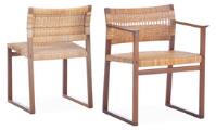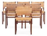 Sæt på seks stole af mahogni, heraf to med armlæn. Sæde og ryg med flet. Model BM 61 og BM 62. Formgivet 1957. Udført hos Fredericia Stolefabrik, tre stole med mærkat. (6)
