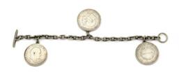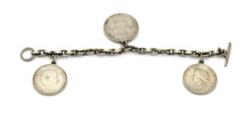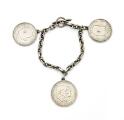 A bracelet set with three coins, mounted in silver. Weight app. 71.5 g. Coins incl. eye-lets L. 4.1 cm. L. app. 20 cm.
