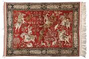 Qum silketæppe, Persien. Klassisk jagtsceneri omgivet af hovedbort med periske digte. 20. årh.s slutning. 109×150.