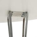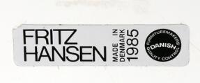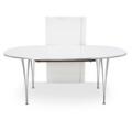 “Superellipse”. Spisebord med udtræk og to tillægsplader, klemben af forkromet stål. Top af hvid laminat og aluminiumskant. Model B419. Udført og mærket hos Fritz Hansen, 1985. H. 71. L. 180/300. B. 120. (3)
