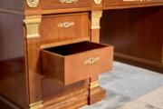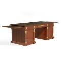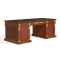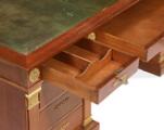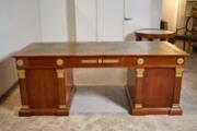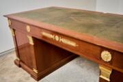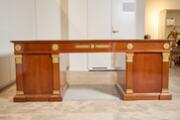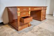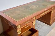 A French Empire style mahogany and gilt bronze mounted partners desk with gilt tooles green leather top. One drawer labeled “Garrigou & Cie, 90 Boulevard Diderot, PARIS”. C. 1900. H. 75 cm. L. 200 cm. W. 90 cm.