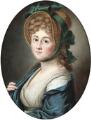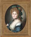 Portrait of Princess Henriette of Schleswig-Holsten-Sonderburg-Beck (1783–1803, with straw hat with green silk ribbons over the light curly hair and wearing a light Empire dress and blue shawl. Gouache on paper. Oval in four-siden Empire frame. Aperture 60×45 cm. Frame size 80×65 cm.
