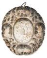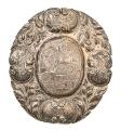 A silver shield, of oval form, embossed with cartouches and foliage, surrounding an engraved light, prancing horse, with a hook at top. Presumably a guild sign for an alderman's goblet. Apparently unmarked. 18th century. Examined to fineness 800. Weight 45 g. H. 13 cm. W. 11.5 cm.