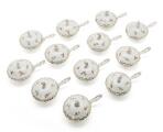 Twelve enamelled and gilt porcelain consommé cups and covers with handles, painted with flowers and ornamentation on white ground. Unmarked, c. 1900. Diam. 9 cm W. incl. the handle 14,5 cm. (12)