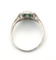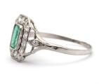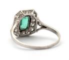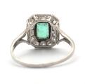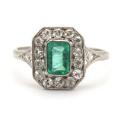 Art Deco smaragd- og diamantring af platin prydet med smaragdslebet maragd omkranset af talrige old-cut diamanter. Vægt ca. 3 g. B. 12 mm. Str. ca. 58.