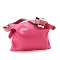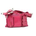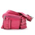 Taske af pink læder med sølvfarvede beslag, justerbar hank, tre udvendige lommer, et rum med magnetlukning, en indvendig lynlås lomme og pink satin for. H. 26 x B. 31 x D. 3 cm.