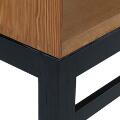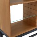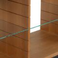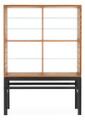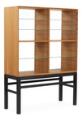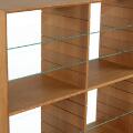 Reol af massiv oregonpine med justerbare hylder af glas, med understel af salmiakbejdset eg. Udført og stemplet af snedker Peter Leth for A. Petersen, 2017. H. 178. B. 126. D. 48.