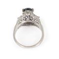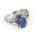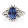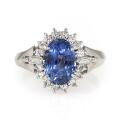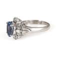 Safir- og diamantring af platin prydet med oval facetslebet safir på ca. 2.74 ct. omkranset af to baguetteslebne og talrige brillantslebne diamanter på i alt ca. 0.28 ct. B. 1,3 cm. Str. 48.
